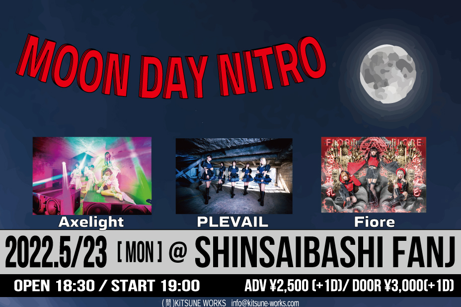 Schedule BACK TO LIST 2022.5.23[Mon] 心斎橋FANJ MOON DAY NITRO 【チケット】 https://t.livepocket.jp/e/mdn0523 前売りチケット¥2,500 一般販売:2022/5/12(木)20:00~2022/5/22(日)23:59 VENUE 心斎橋FANJ 大阪府大阪市中央区東心斎橋1丁目7−3 島之内シティーハイツ TIME 開場 / 18:30 開演 / 19:00 TICKET 前売 ¥ 2,500 / 当日 ¥ 3,000 ACT Axelight / PLEVAIL / Fiore