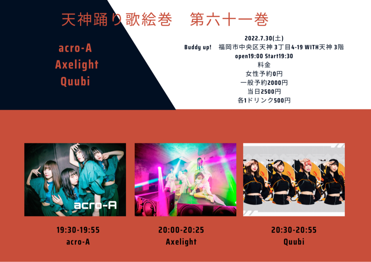 Schedule BACK TO LIST 2022.7.30[Sat] Buddy up! 天神踊り歌絵巻 第六十一巻 【チケット】 https://tiget.net/events/193747 女性予約¥0 一般予約¥2,000 予約開始:2022/7/18(月/祝)21:00~ VENUE Buddy up! 福岡県福岡市中央区天神 3丁目4-19 WITH天神 3階 TIME 開場 / 19:00 開演 / 19:30 TICKET 前売 ¥ 2,000 / 当日 ¥ 2,500 ACT Axelight / acro-A / Quubi