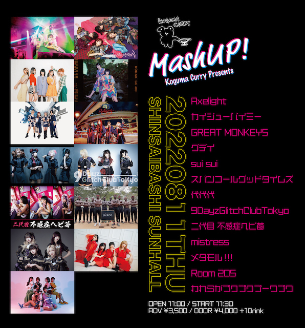 - Axelight / カイジューバイミー / GREAT MONKEYS / グデイ / sui sui / スパンコールグッドタイムズ / 代代代 / 9DayzGlitchClubTokyo / 二代目 不感症ヘビ苺 / mistress / メタモル!!! / Room 205 / われらがプワプワプーワプワ