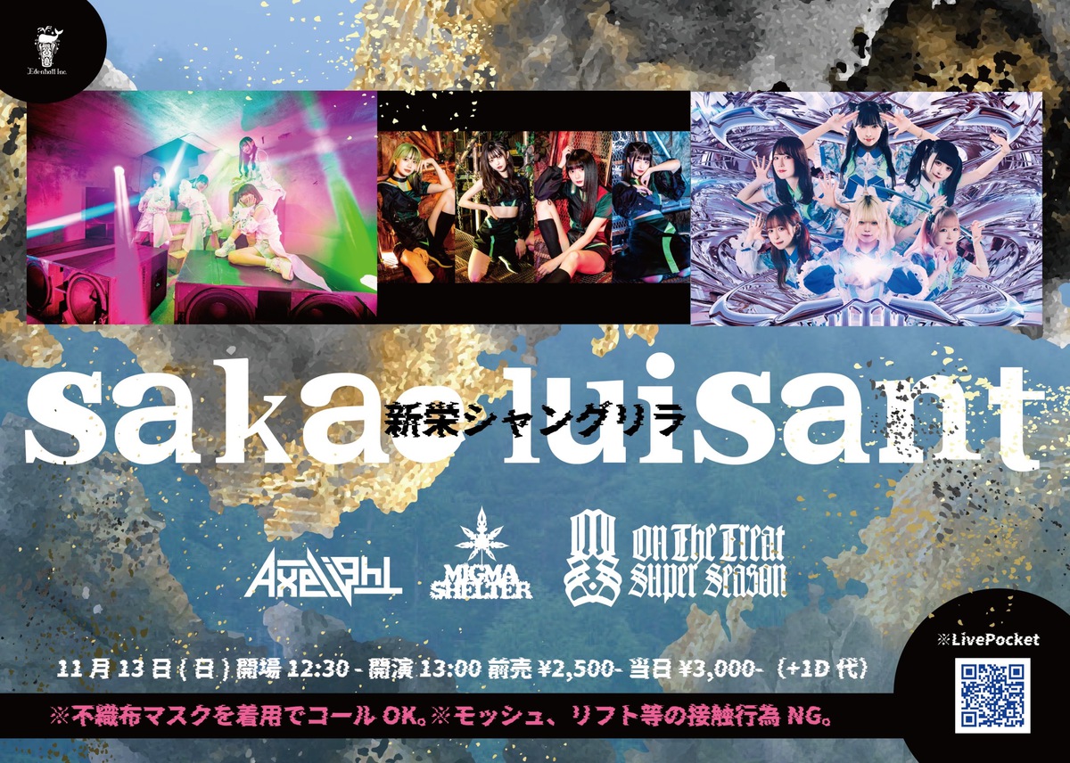 Schedule BACK TO LIST 2022.11.13[Sun] 新栄シャングリラ sakae luisant 【チケット】 t.livepocket.jp/e/sakaelui1113 前売りチケット¥2,500 先行販売:2022/9/29(木)21:00~2022/10/6(木)23:59 一般販売:2022/10/8(土)~ VENUE 新栄シャングリラ 愛知県名古屋市中区新栄2丁目1−9 雲竜フレックスビル東館 B1F TIME 開場 / 12:30 開演 / 13:00 TICKET 前売 ¥ 2,500 / 当日 ¥ 3,000 ACT Axelight / MIGMA SHELTER / On the treat Super Season