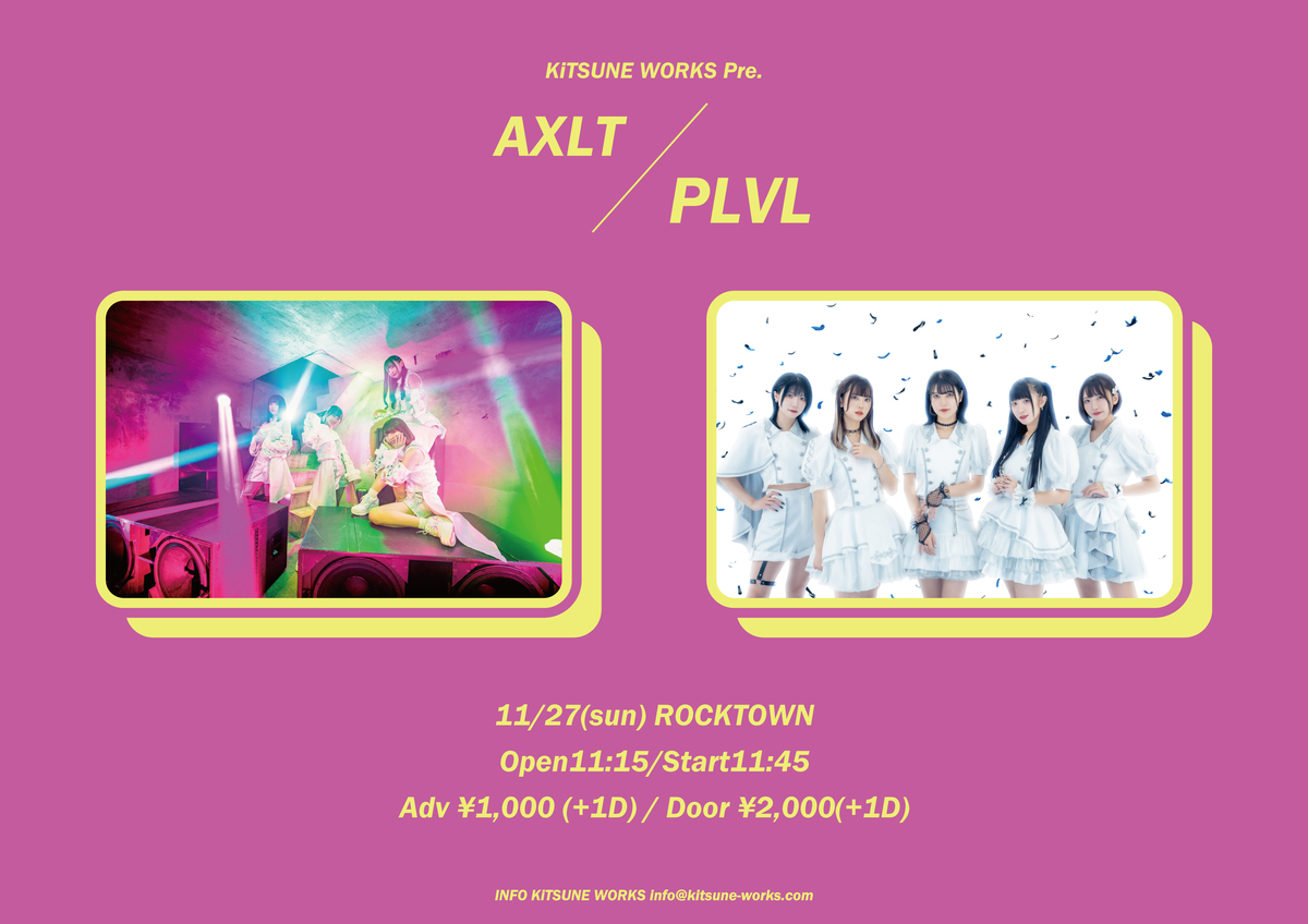 Schedule BACK TO LIST 2022.11.27[Sun] ROCKTOWN KiTSUNE WORKS Pre.「AXLT/PLVL」 【チケット】 https://t.livepocket.jp/e/1127kw 前売りチケット¥1,000 一般販売:2022/11/22(火)21:00~2022/11/26(土)23:59 VENUE ROCKTOWN 大阪府大阪市阿倍野区阿倍野筋1-6-1 あべのキューズモール4F TIME 開場 / 11:15 開演 / 11:45 TICKET 前売 ¥ 1,000 / 当日 ¥ 2,000 ACT Axelight / PLEVAIL