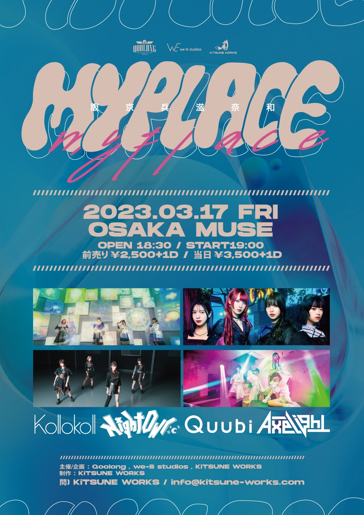 Schedule BACK TO LIST 2023.3.17[Fri] OSAKA MUSE MYPLACE 【チケット】 https://eplus.jp/myplace 前売りチケット¥2,500 一般販売:2023/1/27(金)21:00〜2023/3/16(木)23:59 VENUE OSAKA MUSE 大阪府大阪市中央区心斎橋筋1丁目5−6 ミューズ389ビル4F TIME 開場 / 18:30 開演 / 19:00 TICKET 前売 ¥ 2,500 / 当日 ¥ 3,500 ACT Axelight / Kolokol / NightOwl / Quubi