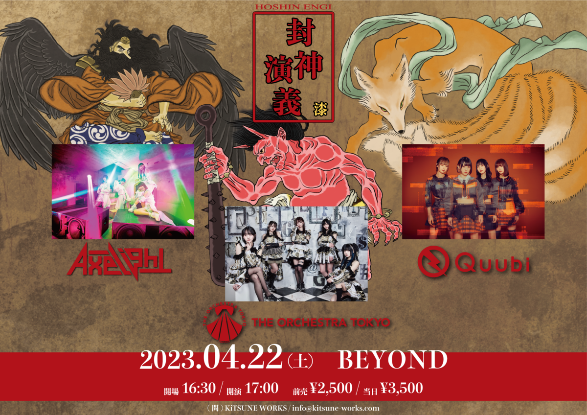 Schedule BACK TO LIST 2023.4.22[Sat] BEYOND 封神演義 漆 【チケット】 https://eplus.jp/hoshinengi 前売りチケット¥2,500 一般販売:2023/3/16(木)19:00〜2023/4/21(金)23:59 VENUE BEYOND 大阪府大阪市中央区西心斎橋2-18-9 ITビルB2F TIME 開場 / 16:30 開演 / 17:00 TICKET 前売 ¥ 2,500 / 当日 ¥ 3,000 ACT Axelight / Quubi / THE ORCHESTRA TOKYO