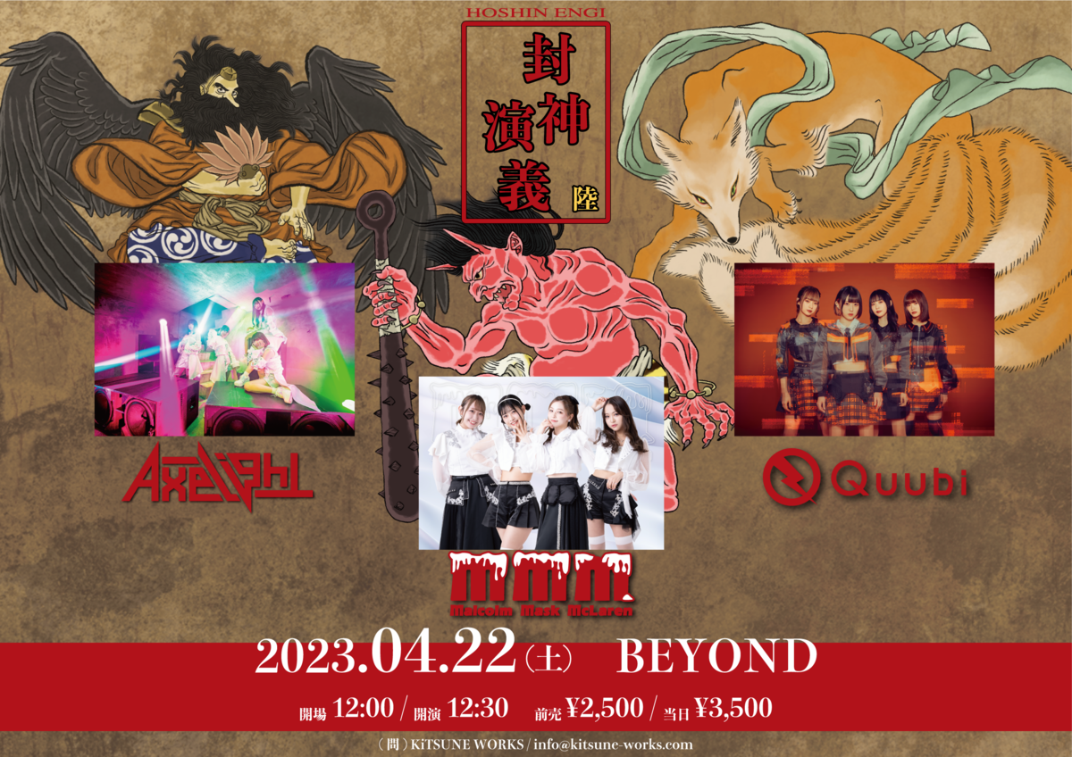 Schedule BACK TO LIST 2023.4.22[Sat] BEYOND 封神演義 陸 【チケット】 https://eplus.jp/hoshinengi 前売りチケット¥2,500 一般販売:2023/3/16(木)18:00〜2023/4/21(金)23:59 VENUE BEYOND 大阪府大阪市中央区西心斎橋2-18-9 ITビルB2F TIME 開場 / 12:00 開演 / 12:30 TICKET 前売 ¥ 2,500 / 当日 ¥ 3,500 ACT Axelight / Malcolm Mask McLaren / Quubi