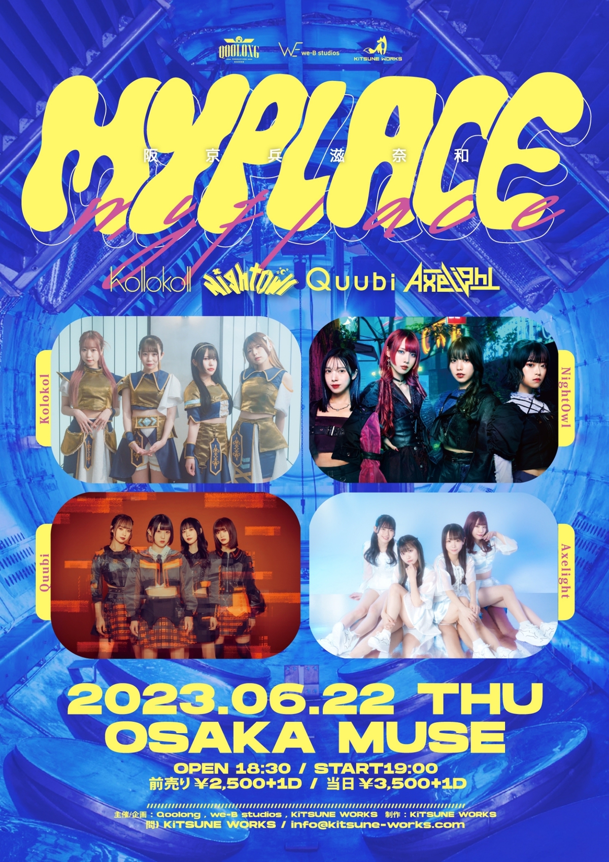 Schedule BACK TO LIST 2023.6.22[Thu] OSAKA MUSE MYPLACE 【チケット】 https://eplus.jp/myplace 前売りチケット¥2,500 一般販売:2023/5/26(金)21:00〜2023/6/21(水)23:59 VENUE OSAKA MUSE 大阪府大阪市中央区心斎橋筋1丁目5−6 ミューズ389ビル TIME 開場 / 18:30 開演 / 19:00 TICKET 前売 ¥ 2,500 / 当日 ¥ 3,500 ACT Axelight / Kolokol / NightOwl / Quubi