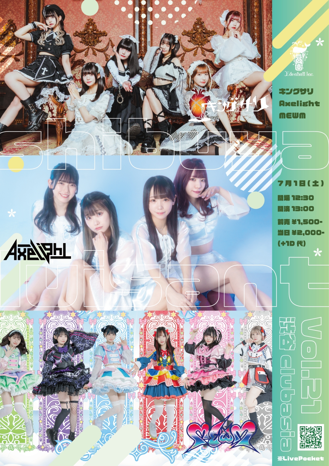 Schedule BACK TO LIST 2023.7.1[Sat] 渋谷clubasia shibuya luisant Vol.21 【チケット】 https://t.livepocket.jp/e/luisant0701 前売りチケット¥1,500 一般販売:2023/6/24(土)22:00~2023/6/30(金)23:59 VENUE 渋谷clubasia 東京都渋谷区道玄坂2-21-7 TIME 開場 / 12:30 開演 / 13:00 TICKET 前売 ¥ 1,500 / 当日 ¥ 2,000 ACT Axelight / キングサリ / MEWM