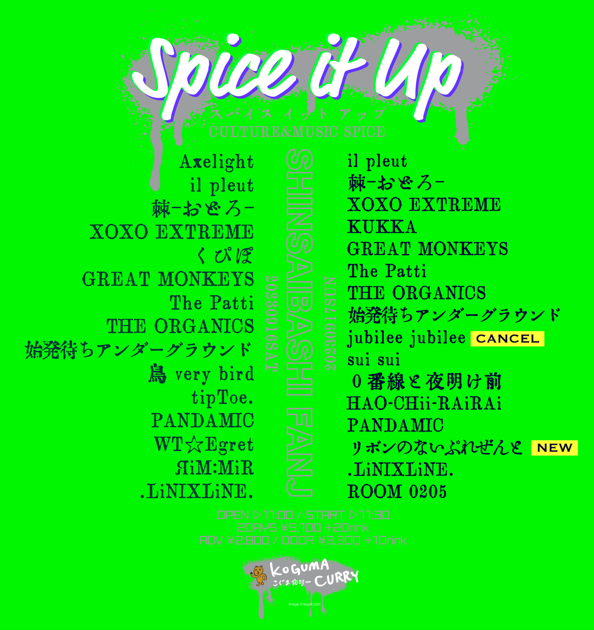 - Axelight / il pleut / 棘ーおどろー / XOXO EXTREME / くぴぽ / GREAT MONKEYS / The Patti / THE ORGANICS / 始発待ちアンダーグラウンド / 鳥 very bird / tipToe. / PANDAMIC / WT☆Egret / ЯiM:MiR / .LiNIXLiNE. / リボンのないぷれぜんと
