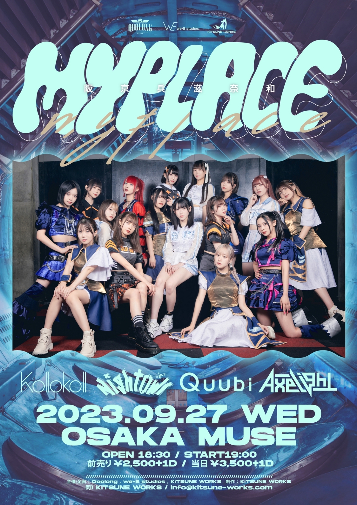 Schedule BACK TO LIST 2023.9.27[Wed] OSAKA MUSE MYPLACE 【チケット】 https://eplus.jp/myplace 前売りチケット¥2,500 一般販売:2023/8/28(月)19:00〜2023/9/26(火)23:59 VENUE OSAKA MUSE 大阪府大阪市中央区心斎橋筋1丁目5−6 ミューズ389ビル4F TIME 開場 / 18:30 開演 / 19:00 TICKET 前売 ¥ 2,500 / 当日 ¥ 3,500 ACT Axelight / Kolokol / NightOwl / Quubi