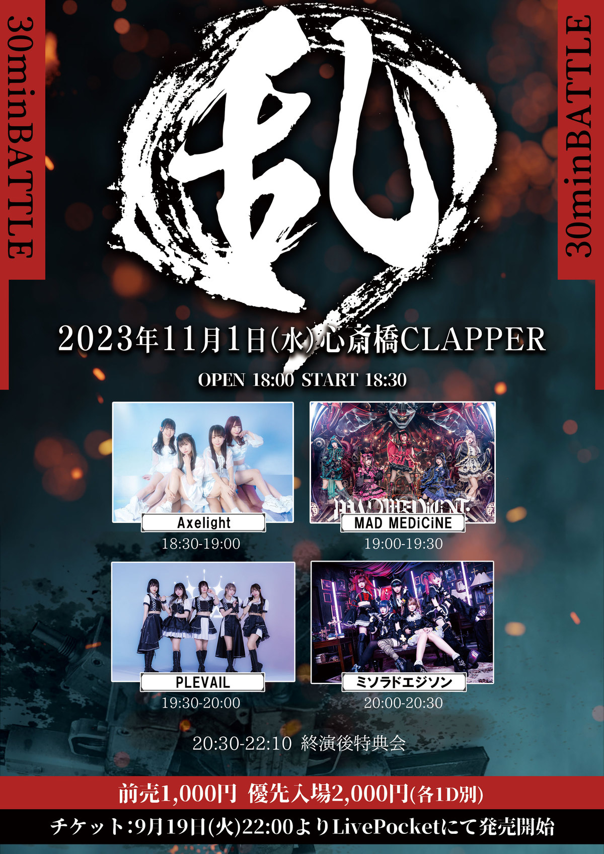 Schedule BACK TO LIST 2023.11.1[Wed] 心斎橋CLAPPER 乱 【チケット】 https://t.livepocket.jp/e/ran_01 優先チケット:¥2,000 前売りチケット¥1,000 一般販売:2023/9/19(火)22:00〜 VENUE 心斎橋CLAPPER 大阪府大阪市中央区東心斎橋1丁目12−17 TIME 開場 / 18:00 開演 / 18:30 TICKET 前売 ¥ 1,000 / 当日 未定 ACT Axelight / ミソラドエジソン / PLEVAIL / MAD MEDiCiNE