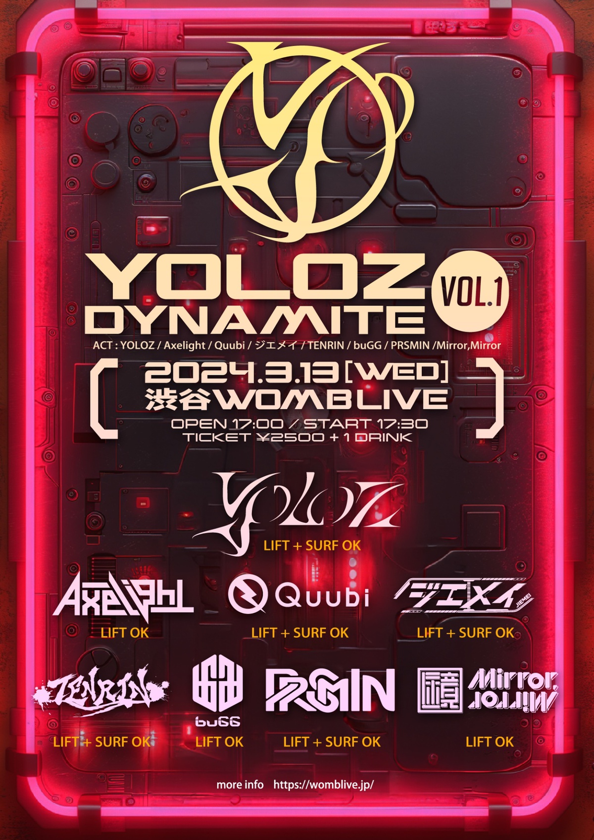Schedule BACK TO LIST 2024.3.13[Wed] WOMBLIVE YOLOZ DYNAMITE Vol.1 【チケット】 https://t.livepocket.jp/e/ivi5v 前売りチケット¥2,500 一般販売:2024/2/16(金)21:00〜2024/3/12(火)23:59 VENUE WOMBLIVE 東京都渋谷区円山町2-16 TIME 開場 / 17:00 開演 / 17:30 TICKET 前売 ¥ 2,500 / 当日 未定 ACT Axelight / Quubi / ジエメイ / TENRIN / buGG / PRSMIN / Mirror,Mirror