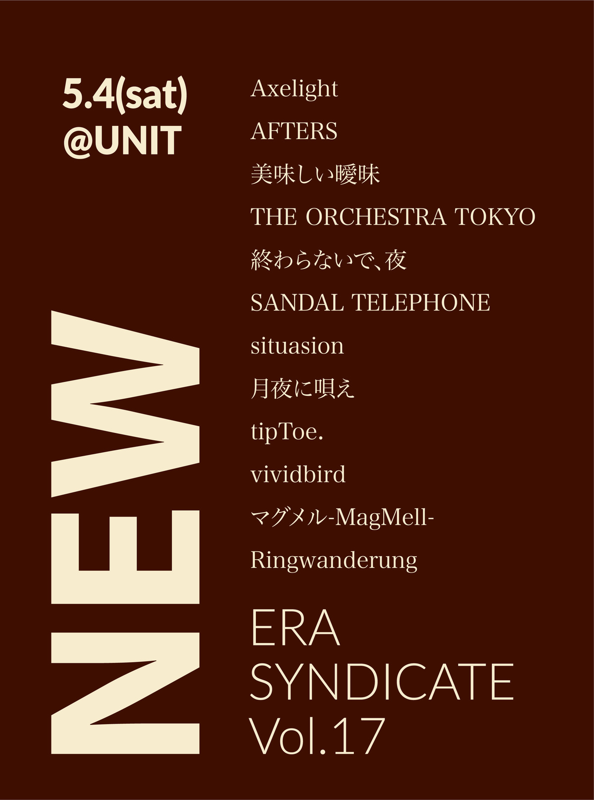 - Axelight / AFTERS / 美味しい曖昧 / THE ORCHESTRA TOKYO / 終わらないで、夜 / SANDAL TELEPHONE / situasion / 月夜に唄え / tipToe. / vividbird / マグメル-MagMell- / Ringwanderung